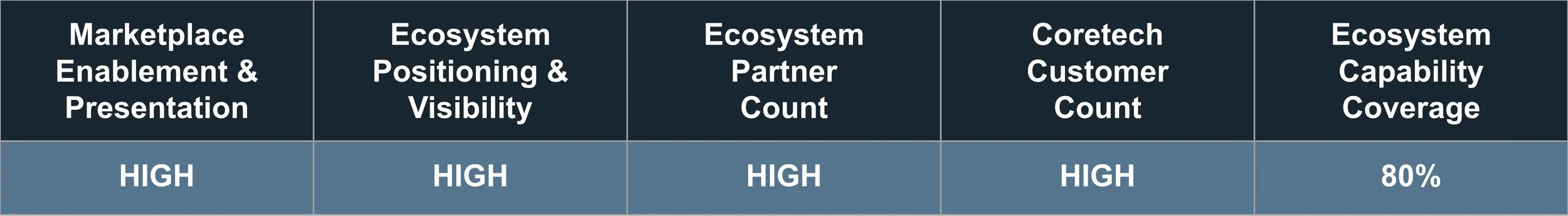 In a mature market, where it can seem that every vendor is offering the same coretech solutions, ecosystems provide buyers, partners, and investors with a distinct and invaluable signal of vendor capability and long-term viability. It requires dedicated time and effort for a coretech vendor to articulate an ecosystem strategy, onboard new partners, present partners coherently, and provide customers with ready access to these solutions. Cultivating a healthy ecosystem cannot be done overnight. The progress a coretech vendor has made in its ecosystem journey is an excellent proxy for its overall health.