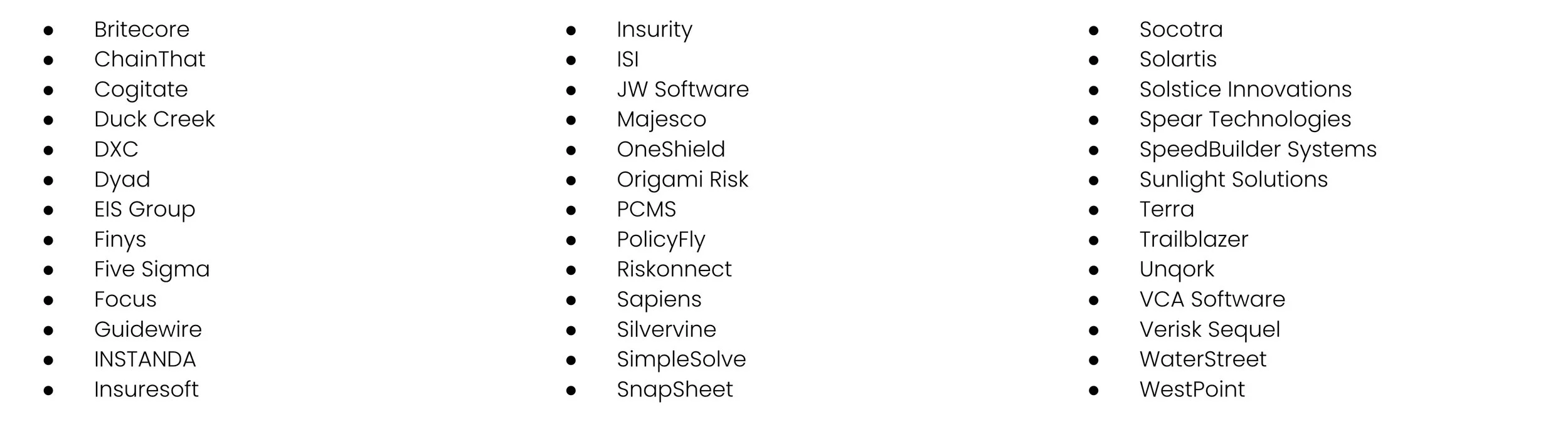 From these reviews, we catalogued over 600 ecosystem partners and mapped these to 30 categories and over 100 subcategories. We also cross-referenced our ecosystem findings with our data on over 1,800 customers (primarily carriers and MGAs) publicly announced by these coretech vendors.